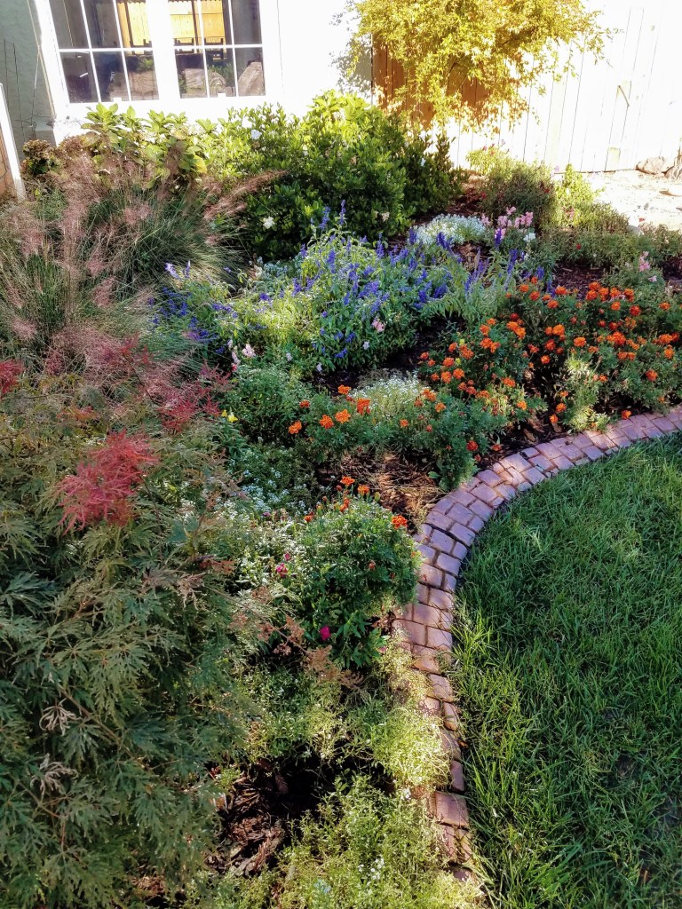 I love to garden! It’s in my blood; I tried to resist it for a long time (all through college and well into adulthood), but ultimately I couldn’t deny how much joy it brings to my life. This is a picture of my front garden at the end of summer. I have anchor plants but change the others every season.